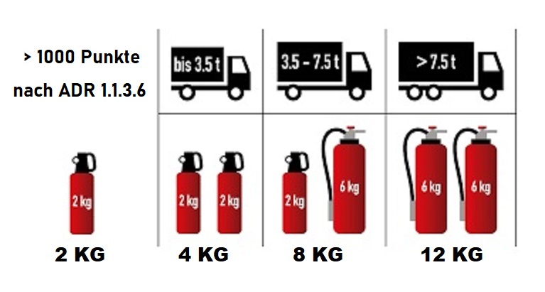 Ab 7,5 to Gesamtmasse wird eine Löschmittelmenge von mindestens 12 kg gefordert = 2 Stück je 6 kg