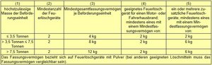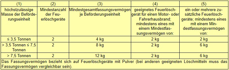 Die nachfolgende Tabelle zeigt die Mindestvorschriften für tragbare Feuerlöschgeräte für die Brandklassen (Definition der Brandklassen siehe Norm EN 2:1992 + A1:2004 Brandklassen) A, B und C, die für Beförderungseinheiten gelten, die andere gefährliche Güter als die in Unterabschnitt 8.1.4.2 (1000-Punkte-Regel) genannten befördern :