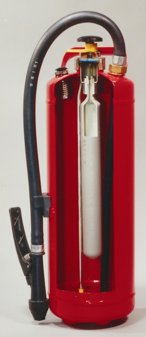 Ein "Auflade"-Löschgerät steht nicht permanent unter Druck, sondern erst nach Auslösung des Treibmittels per Hebel oder Schlagknopf.