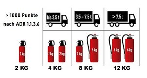 Ab 7,5 to Gesamtmasse wird eine Löschmittelmenge von mindestens 12 kg gefordert = 2 Stück je 6 kg